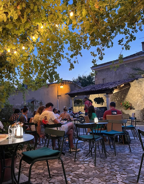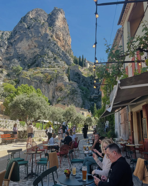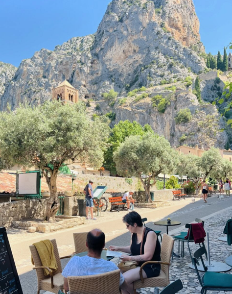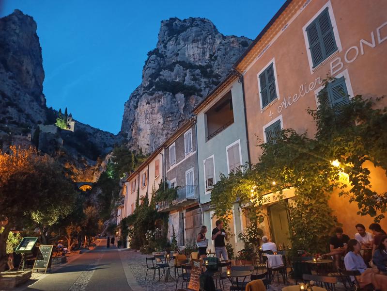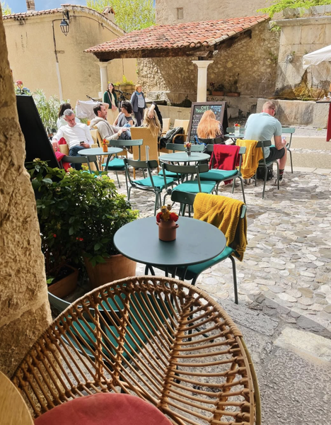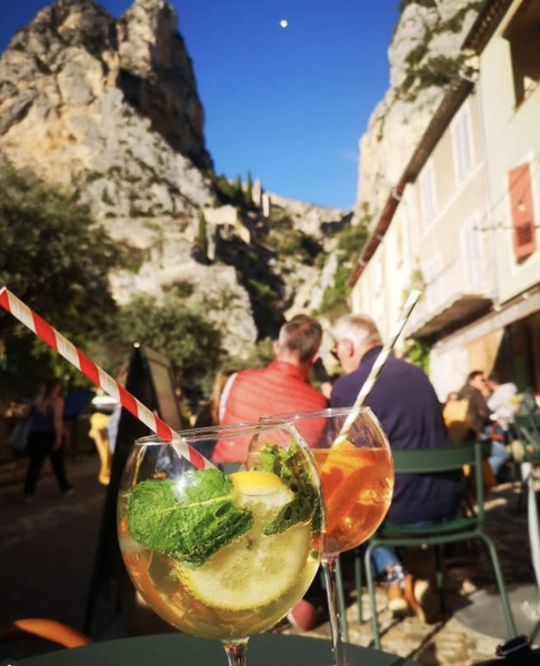 Nice café in the heart of the village offering organic (where possible), local and gourmet products. Wide choice of local beers and drinks, cocktails and tapas! Terrace overlooking the chapel and rocks of Moustiers. Service non stop. Vegetarian options.