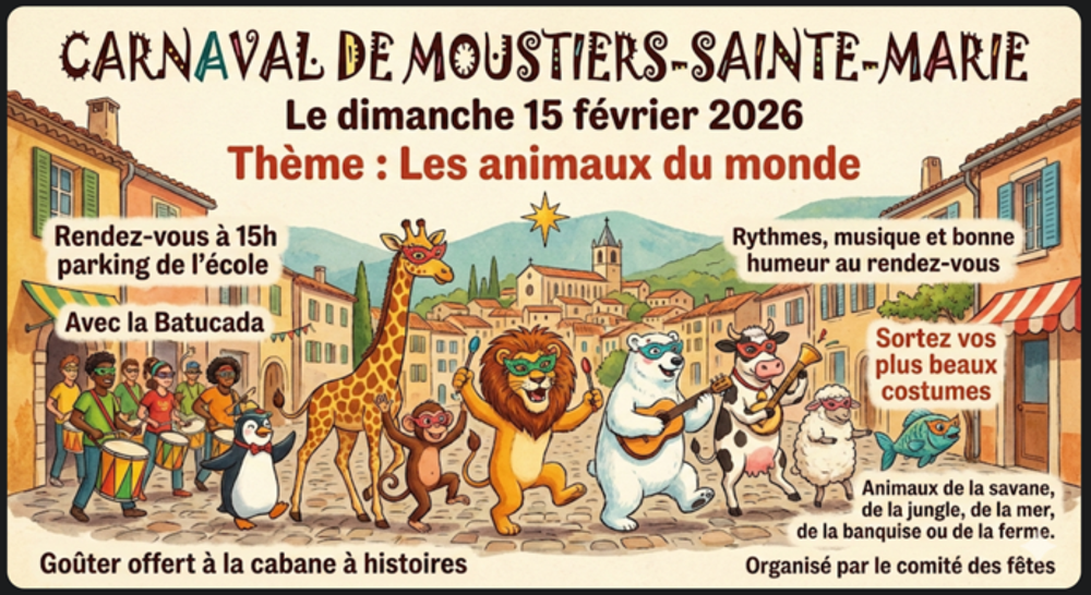 Dimanche 15 Février 2026, à 15h, petits et grands, venez costumés pour le carnaval de Moustiers !