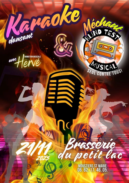 Vendredi 21 Novembre 2025, soirée karaoké dansant animé par Hervé et "méchant blind test seul contre" tous à la Brasserie du Petit Lac !