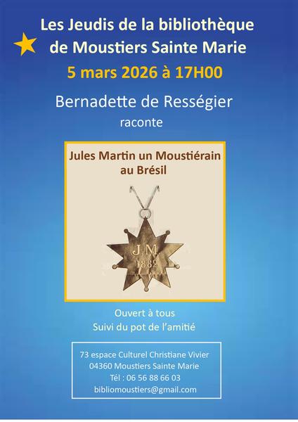 Jeudi 5 Mars 2026 à 17h , rendez-vous à la bibliothèque l'Oustaou dei Libre où Bernadette de Resseguier vous attend pour échanger sur Jules Martin !